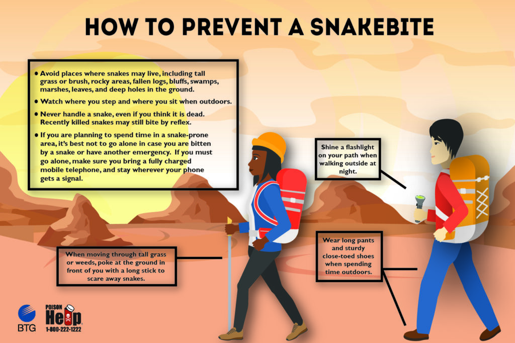 If bitten by a venomous snake, go to the nearest ER immediately and contact poison control at 1-800-222-1222 on the way. Our poison specialists will work with the hospital staff to treat the snakebite.