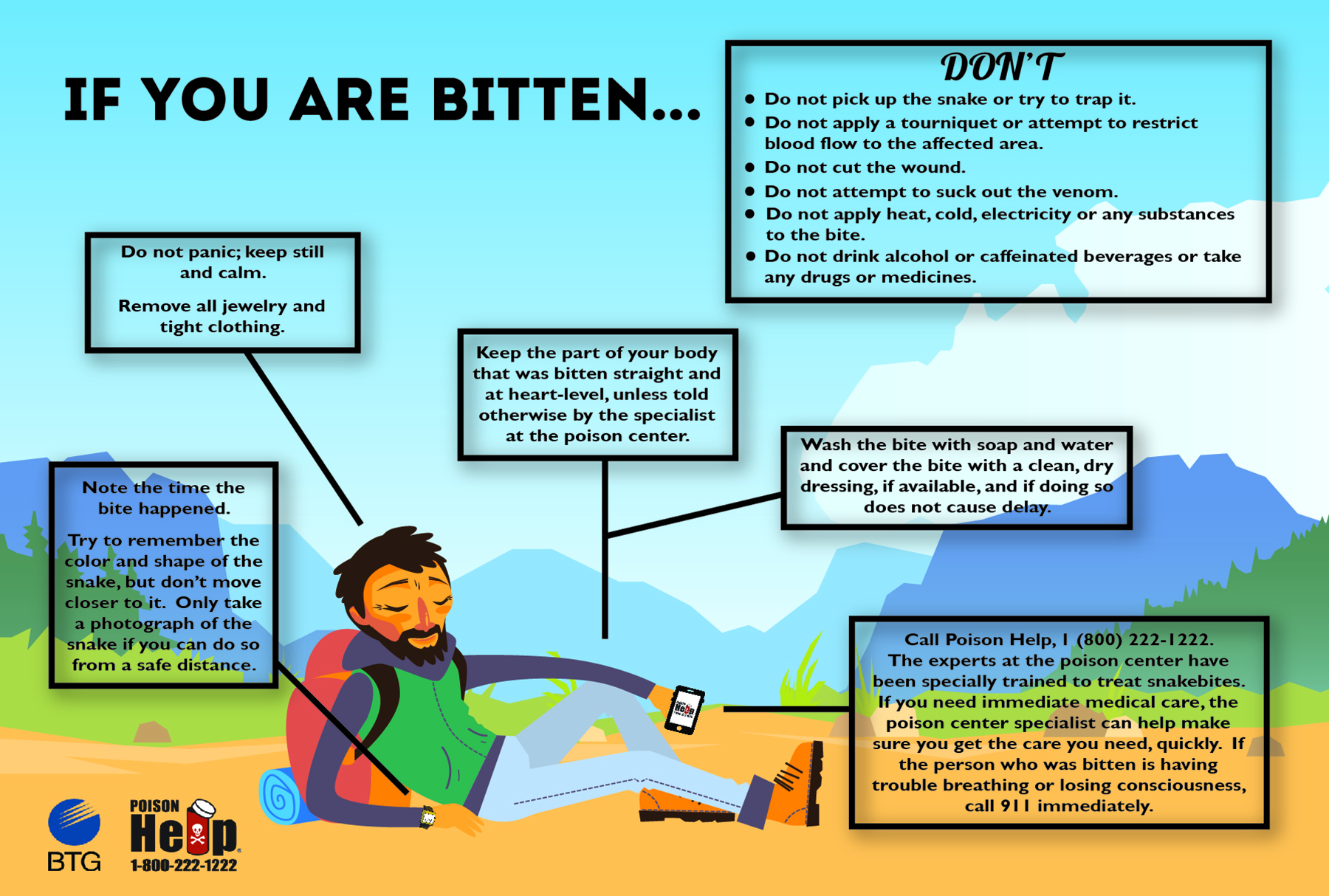 If bitten by a venomous snake, go to the nearest ER immediately and contact poison control at 1-800-222-1222 on the way. Our poison specialists will work with the hospital staff to treat the snakebite.